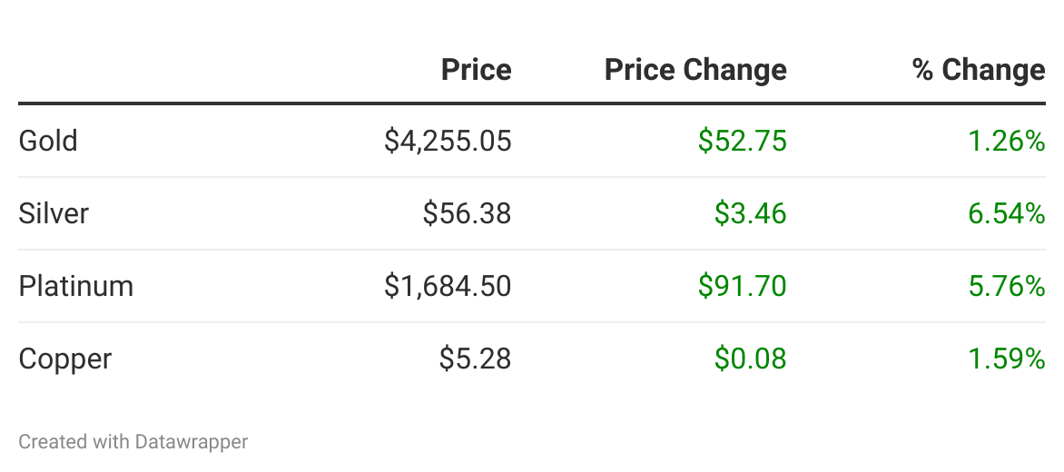 Spot gold rose 1% to a two-week high on Friday, as expectations that the Federal Reserve will trim interest rates next month lifted demand for the non-yielding asset, while silver hit a fresh record high. Spot gold rose 0.9% to $4,192.78 per ounce, its highest since November 14, and was set for a 2.9% weekly gain. Bullion, set to register a 4.6% rise this month, is on track for its fourth consecutive monthly gain. Read on »