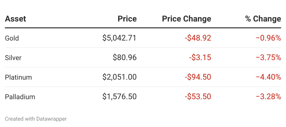 Gold slipped below $5,100 an ounce on Friday, heading towards a second consecutive weekly drop, as high energy prices stemming from the Middle East war continue to drive high-interest expectations. Silver, meanwhile, was hit harder, down almost 5% and just holding the $80-an-ounce level. Read on »