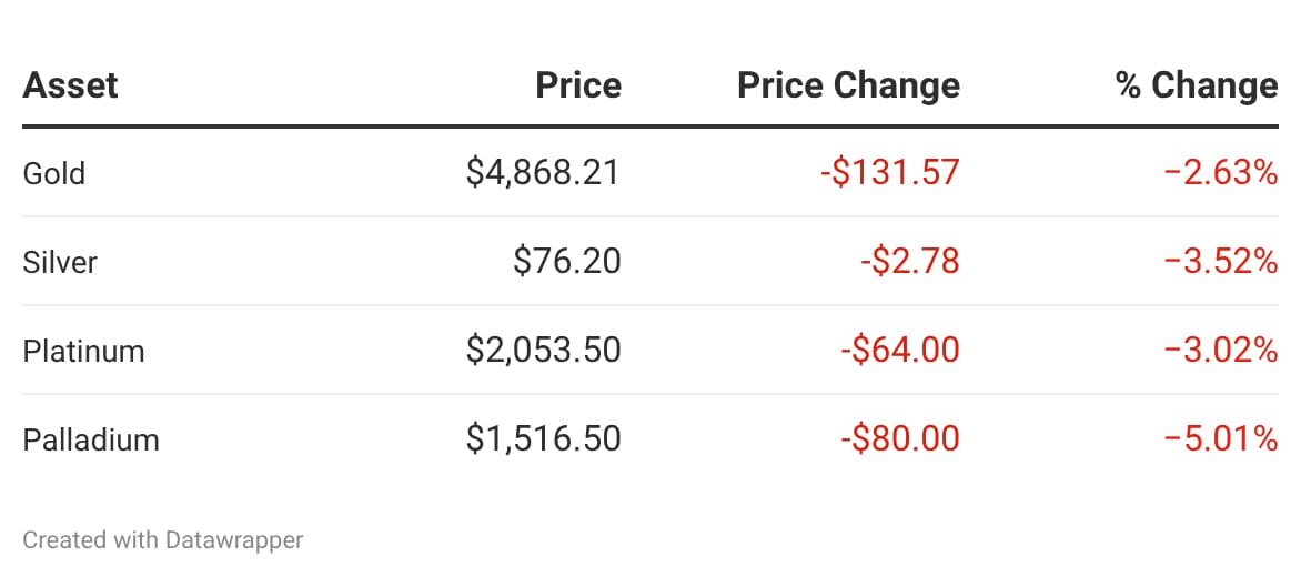 Gold prices were lower on Wednesday after the Federal Reserve kept its overnight rate unchanged, as was expected. Spot gold traded 2.2% lower at $4,895.61 per ounce. Gold futures lost 2.4% to trade at $4,889.80 per ounce. While the Fed held policy steady, it still projected to cut rates once in 2026. It also acknowledged uncertainty stemming from the U.S.-Iran war. Read on »